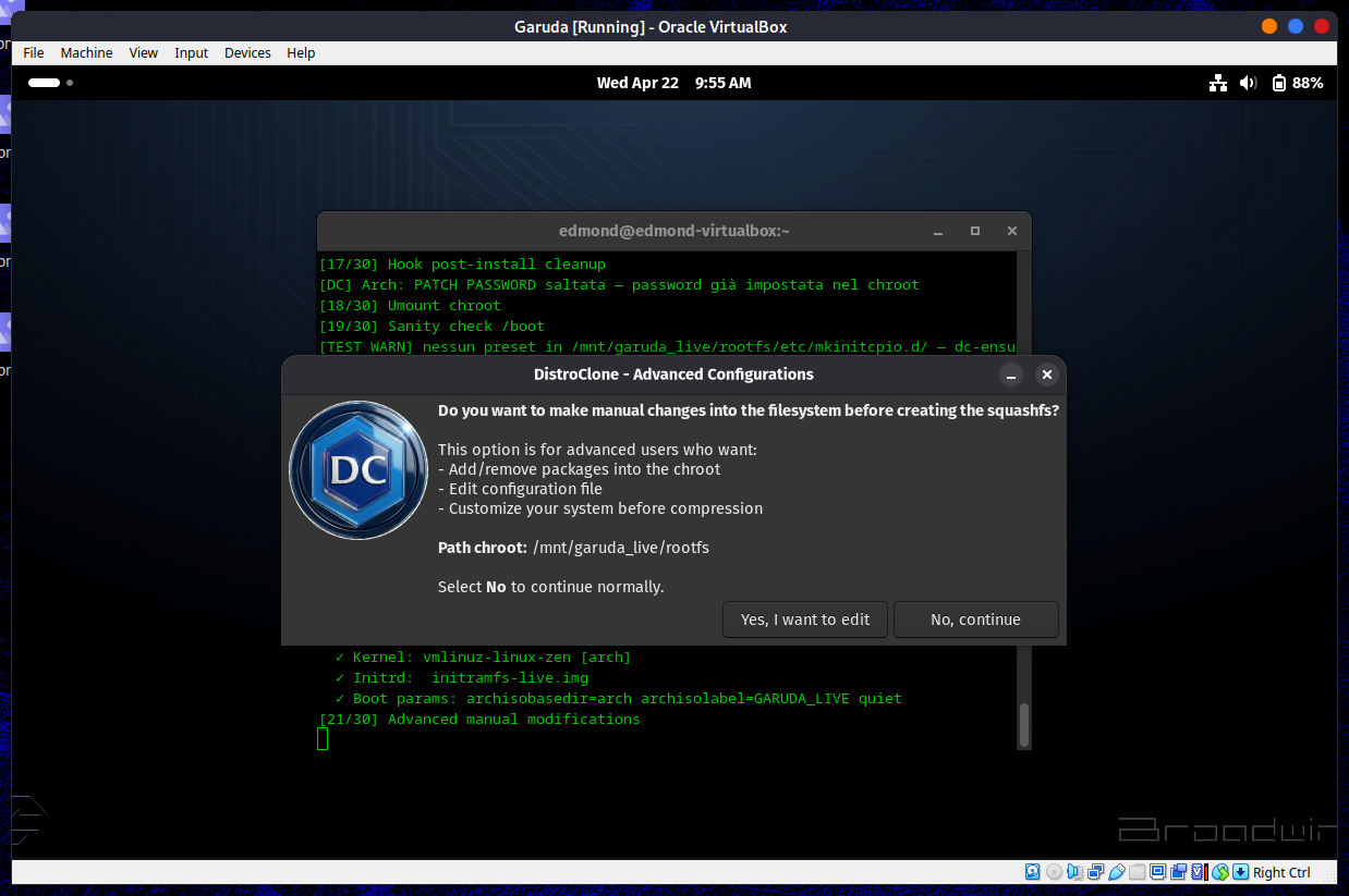 Prima della compressione squashfs, DistroClone offre un **punto di pausa interattivo** che permette modifiche manuali al filesystem clonato. Questa funzione è pensata per utenti avanzati.