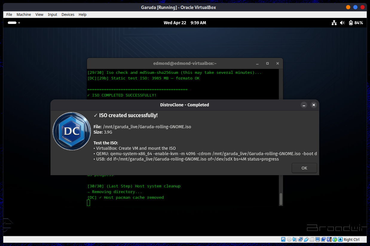 *La schermata finale conferma il successo e fornisce il percorso della ISO e i comandi per testarla con VB, Qemu o dd.*